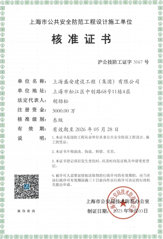 三级,机电工程施工总承包二级,电子与智能化工程专业承包一级,消防设施工程专业承包一级,建筑装修装饰工程专业承包二级,建筑机电安装工程专业承包二级,施工劳务企业资质劳务分包不分级(备案),建筑施工安全生产许可证,建筑智能化系统设计专项乙级,消防设施工程设计专项乙级,上海市公共安全防范工程设计施工单位三级;并通过GB/T19001-2016/ISO9001:2015和GB/T50430-2017质量管理体系标准认证、GB/T24001-2016/ISO14001:2015环境管理体系标准认证、GB/T45001:2020/ISO45001:2018职业健康安全管理体系标准认证。 “以人为本”是公司治理、发展的根本理念,公司拥有一批技术精干的专业人员和优秀的管理团队。公司发起人及主要管理人员从事消防、智能化、涂装工艺设备事业已超过30年,包括消防系统(火灾报警系统、可燃/有毒气体探测报警系统、以及气体灭火系统、高压细水雾灭火系统、洒水喷淋灭火系统、泡沫灭火系统、干粉灭火系统、钢结构防火涂料等系统);智能化系统(监控系统工程、安全技术防范系统、数据中心/电子机房工程等相关系统);涂装工艺设备(鸵鸟毛擦净系统、离子风吹扫系统)在内的持证人员中:建造师14人、工程师19人、注册消防工程师14人、建(构)筑消防员及消防设施操作员53人、安全员证6人、电工证12人、焊工证20人、有毒有害有限空间操作证3人,专业工程技术人员等具备专业资格证书的员工占80%。